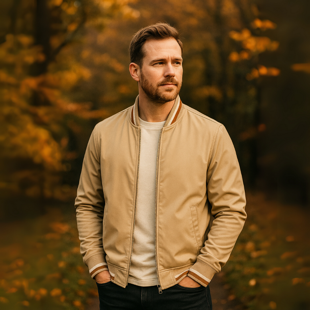 Trek de Mark™ | Elegante bomberjack met strepen aan en voel meteen het verschil. Deze elegante bomberjack combineert de iconische varsity-stijl met een moderne touch, speciaal ontworpen voor mannen die op zoek zijn naar comfort en eenvoud, zonder in te boeten aan elegantie. De lichte stof maakt het een ideale metgezel voor dagelijks gebruik - voor een wandeling, een weekendje weg of een ontspannen avondje uit. Geen poespas, gewoon een jas die je er onder alle omstandigheden goed en comfortabel laat uitzien.